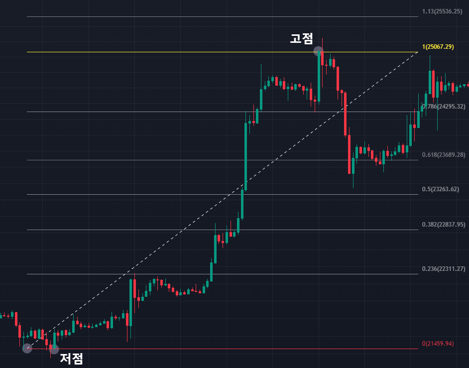 이렇게 차트를 그리면 0.382, 0.5, 0.618 지점에서 추세가 바뀌거나 기존 추세에 대한 반등이나 눌림이 나올 때가 많습니다.