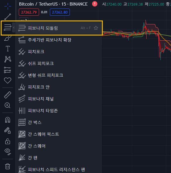 좌측 도구상자에서 피보나치 관련 툴을 찾으세요. 위에서 세 번째에 위치하였고 [>]버튼을 누르면 피보나치 되돌림을 이용할 수 있습니다. 차트화면의 아무 곳에서 왼쪽아래에서 오른쪽 위로 사선방향으로 그리면 됩니다.