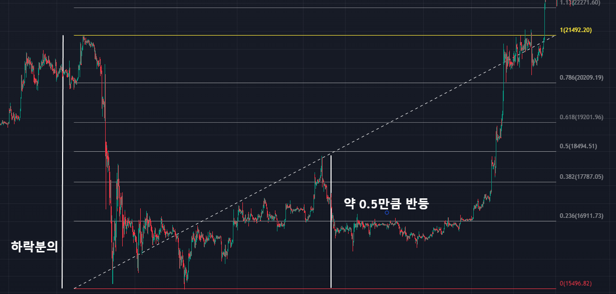 거래소 차트나 트레이딩뷰차트에서 피보나치 되돌림 툴을 사용하면, 가격이 하락한 후 일정 구간까지 상승한 뒤 다시 하락하는 반등 구간을 찾을 수 있습니다. 위사진은 0.5만큼 반등했습니다.