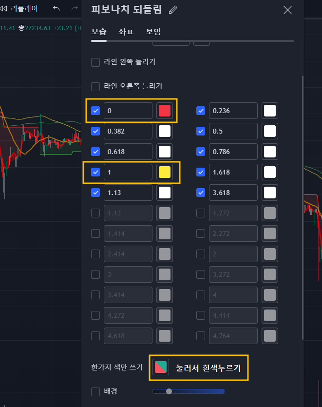이렇게 함으로써, 차트의 저점과 고점에 피보나치를 찍을 때 다른 선들과 혼동하지 않도록 할 수 있습니다.